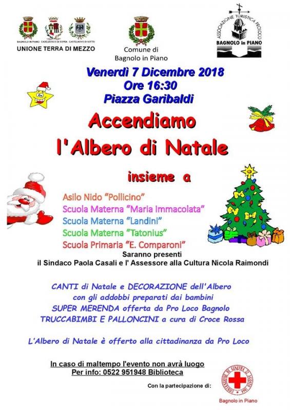 BAGNOLO IN PIANO – a Bagnolo il 7 dicembre si accenderanno gli alberi di Natale, con un bel momento rivolto a tutta la comunità ma in particolare ai bambini. A partire dalle ore 16 in piazza Garibaldi ci sarà l'accensione dell'Albero di Natale decorato con gli addobbi realizzati dei bambini delle materne, nido e primarie del paese (Asilo nido Pollicino, Scuola materna Maria Immacolata, scuola materna Landini, scuola materna Tatonius e scuola primaria E. Comparoni).