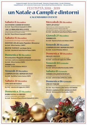 Il 27 dicembre, alle 21, Tombolata alla panetteria-pasticceria “Meloni”, mentre il 28 dicembre seconda tappa del Campionato del mondo di Cucù, alle 21, al Circolo “Il Melatino” di Nocella. Domenica 30 dicembre, alle 16, nel Convento dei Cappuccini, si terrà il Presepe Vivente a cura della Famiglia Francescana di Campli.