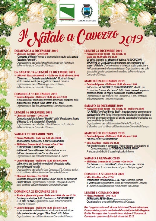 A Cavezzo in provincia di Modena si svolgono nei giorni dal 08 Dicembre 2019 al 06 Gennaio 2020 i festeggiamenti per il Natale.