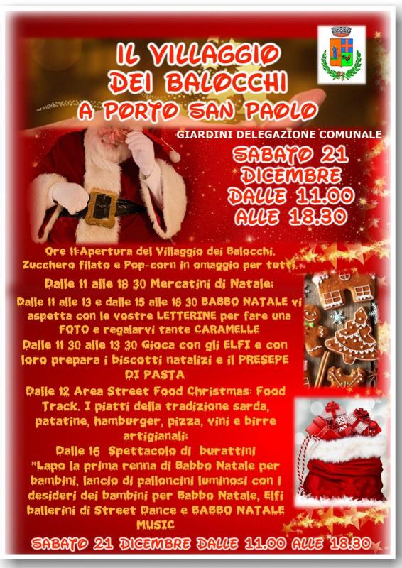 L'Amministrazione comunale Assessorati: Cultura, Sport, Spettacolo, Turismo, Politiche Sociali e Giovanili, invita tutta la popolazione ed i bambini a visitare il Villaggio dei Balocchi a Loiri Porto San Paolo!
