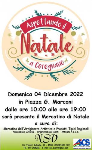 L'Amministrazione Comunale di Ceregnano (RO), in collaborazione con l'Associazione Culturale NSV Organizzazione Eventi APS affiliata A.I.C.S. - Comitato Provinciale di Rovigo, organizzano per Domenica 04 Dicembre 2022, a Ceregnano (RO), in Piazza Guglielmo Marconi, di fronte al Municipio, dalle ore 10:00 alle ore 19:00 il Mercatino Natalizio della Manifestazione "Aspettando il Natale a Ceregnano", che prevede la presenza di Espositori delle Tradizioni Popolari, dell'Artigianato Artistico e delle Opere d'Ingegno Creativo con curiose ed originali Idee Regalo per la Casa ed il Tempo Libero, bancarelle di Prodotti Enogastronomici Tipici Regionali d'Italia e Specialità Alimentari Dolci e Salate Stagionali, Prodotti e Rimedi Naturali per la Cura del Corpo e del Vivere Sano.