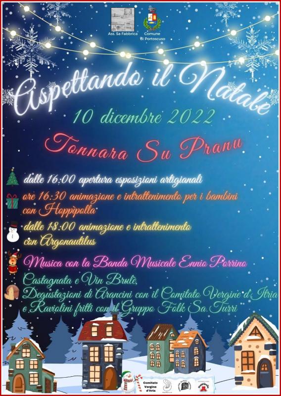 Una giornata ricca di eventi quella del 10 Dicembre, che si aprirá con le esposizioni artigianali, proseguirà in compagnia dell’animazione dedicata ai più piccoli di Hoppípolla Associazione e a quella organizzata da Argonautilus, seguita dalla musica della Banda Musicale "E. Porrino" e dalla castagnata e degustazione offerta dal Comitato Vergine D’Itria e il Gruppo Folkloristico Sa Turri - Portoscuso.
