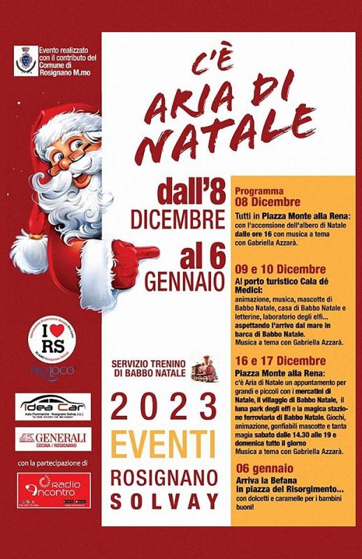 A Rosignano Solvay, frazione del Comune di Rosignano Marittimo, in provincia di Livorno si svolge nei giorni dal 08 Dicembre 2023 al 06 Gennaio 2024 la manifestazione C'è Aria di Natale.