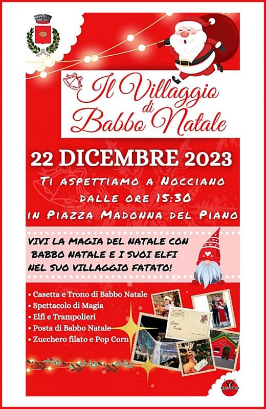 In Piazza Madonna del Piano a Nocciano in provincia di Pescara si svolge nella giornata di Venerdì 22 Dicembre 2023, dalle ore 15.30, il Villaggio di Babbo Natale.
