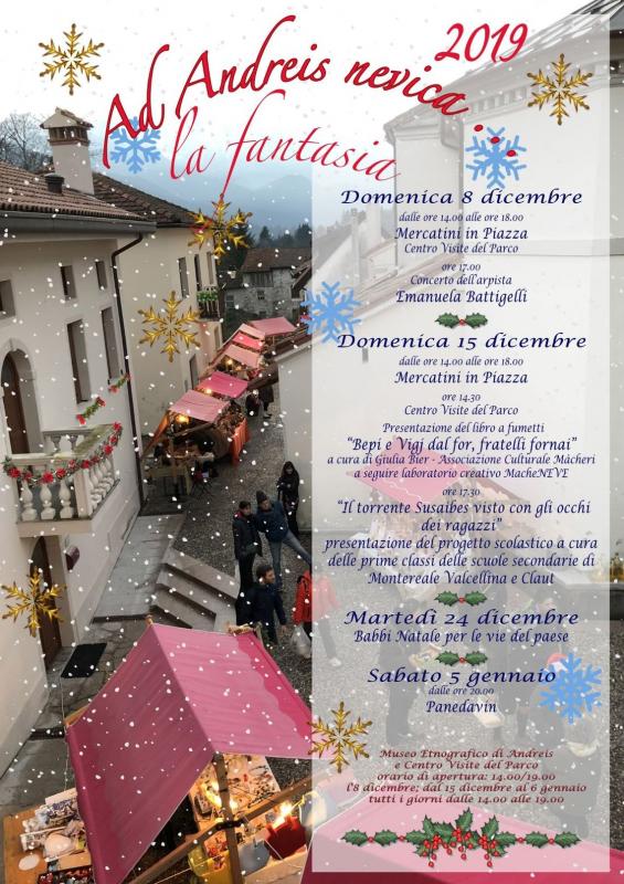 Dal 08 Dicembre al 06 Gennaio, lungo le vie e gli angoli più nascosti di Andreis, verranno allestiti più di 60 alberi di Natale creati con i materiali più disparati.