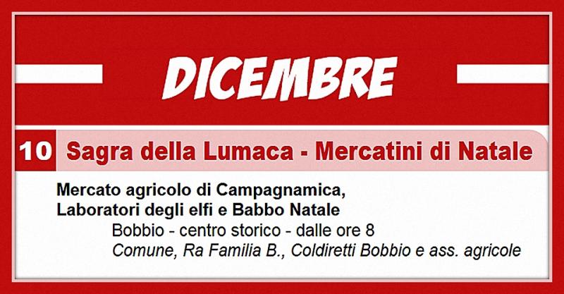 Domenica 10 Dicembre 2023, nel programma degli eventi di Natale a Bobbio, si svolge la Sagra della Lumaca con bancarelle del delizioso prodotto di elicicoltura e assaggio offerto dal Comune e Mercatini di Natale, con oggetti natalizie, intrattenimenti per i bambini, nella suggestiva cornice del borgo antico di Bobbio.