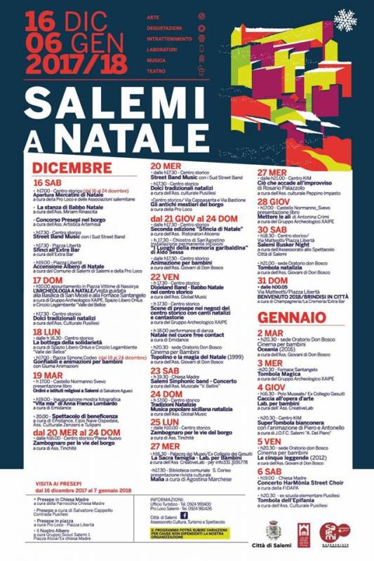 Salemi a Natale 2017. Il programma delle festività natalizie a cura dell'Amministrazione, dei cittadini e delle associazioni, inizia il 16 dicembre 2017 e termina il 6 gennaio 2018.