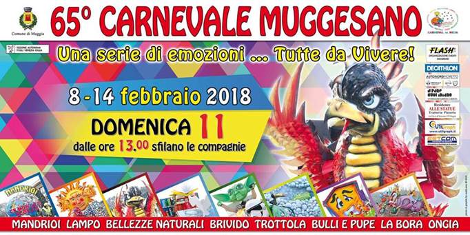 E con questo, sono 65. E’ stata presentata oggi (venerdì 26 gennaio 2018) alle ore 11.00 presso il Museo d'Arte Moderna “Ugo Carà” di Muggia, dal Sindaco di Muggia, Laura Marzi, dall’Assessore ai Grandi Eventi, Cura e Promozione della Città con delega al Carnevale, Stefano Decolle e dal Presidente dell’Associazione delle Compagnie del Carnevale Muggesano, Mario Vascotto alla presenza della Madrina dell'edizione 2018, la performer di levatura internazionale Daniela Pobega, brasiliana e muggesana e di Vincenzo Rovinelli di Flash Srl., la 65esima edizione del Carnevale Muggesano.
