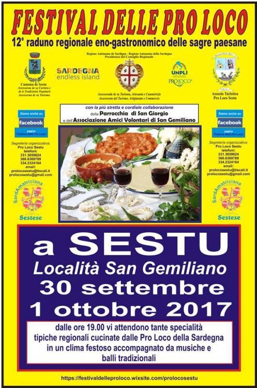 Alle 20 l’esibizione dei balli tradizionali della Sardegna e i canti popolari del Coro Serpeddì di Sinnai. Il coordinamento della raccolta differenziata sarà curato dal gruppo Scout “Il Ponte” di Sestu. Per la sindaca Paola Secci: <<E’ un’occasione molto importante di promozione turistica delle peculiarità di Sestu e un momento di condivisione con altre Pro Loco>>. Il presidente della Pro Loco Mario Ziulu spiega le finalità della kermesse: <<La manifestazione si pone l’obiettivo di creare un appuntamento annuale, unitario e unificante che possa far incontrare le Pro Loco della Regione, con tutto il loro bagaglio di conoscenze, ricerche ed entusiasmo. Sarà occasione di interscambi culturali ed enogastronomici. A San Gemiliano porteremo la Sardegna dalle mille sagre in un unico appuntamento>>.