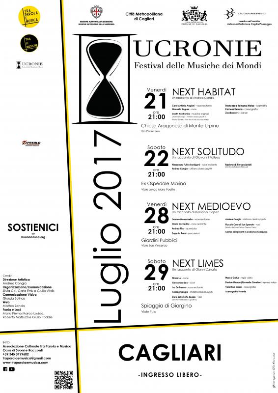Quattro Racconti, quattro Mondi, quattro Location, quattro Performance, decine di Artisti: questa la prima edizione del Festival delle Musiche dei Mondi - UCRONIE. Nelle ultime due settimane del mese di Luglio una trasformazione in atto per ogni appuntamento, dall’immaginazione, all’idea fantamusicale, alla performance, passando per racconti, drammatizzazioni, canti, composizioni coreutiche e altro ancora. Durante le performance, che avranno il compito di evocare dei veri e propri Mondi sonori, sarà la Musica, in qualità di amplificatore espressivo ed emotivo, che farà da collante estetico per tutte le altre Arti che, insieme, daranno fattezze, corpo e vita a queste Irreali Realtà. Luglio 2017 è il tempo di Ucronie, dove ogni Mondo, immaginario, alternativo, improbabile, fantastico, impossibile sarà evocato nelle location prescelte. Musica, Narrativa, Teatro, Danza, Arti Visive spalancheranno le porte su nuovi Spazi e nuovi Tempi che si materializzeranno in quattro diversi luoghi della Città di Cagliari, pieni di bellezza e storia.