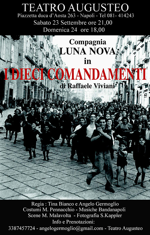 Al Teatro Augusteo di Napoli, sabato 23 e domenica 24 settembre, sarà in scena lo spettacolo “I dieci comandamenti” di Raffaele Viviani, opera in prosa dai forti contenuti umani e sociali, con 26 attori in costume d’epoca, ambientato negli anni del dopoguerra e con musiche rigorosamente eseguite dal vivo.