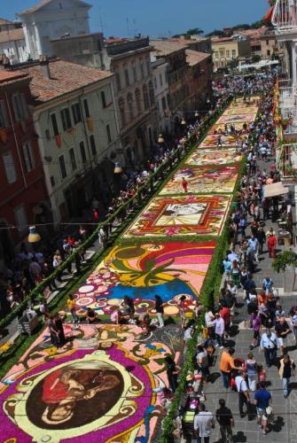 Quest’anno l’Infiorata si terrà il 17, il 18 e il 19 giugno nella nostra antica via Livia, oggi via Italo Belardi, che per l’occasione sarà ricoperta di un tappeto fiorito che si estende per quasi 2.000 metri quadrati e impegna circa 415.000 steli di garofano per colorare i quadri. Ovviamente tutto il materiale utilizzato proviene dal mondo vegetale, non parliamo solo di garofani ma anche di: ginestra, sausa, finocchiella, seme di pino, crisantemo, corteccia di pino, nero vite, granturco, riso, salvia, peperoncino, grano, soia, bucce di pinoli, origano, nero caffè, crusca, nero pigna. L’elenco può sembrare eccessivamente ampio, ma puntiamo ad una raffigurazione che sia il più possibile fedele di ciò che si tende a riprodurre, e proprio per questo abbiamo la necessità di coprire una vasta gamma di colori per le raffigurazioni.