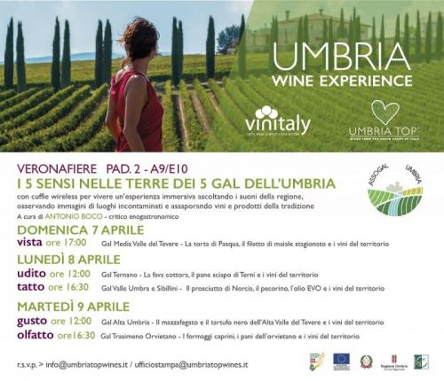 A far emergere punti di contatto e differenze saranno le degustazioni “I 5 sensi nelle terre dei 5 Gal” (Media Valle del Tevere, Ternano, Valle Umbra e Sibillini, Alta Umbria, Trasimeno-Orvietano) con il vino che prenderà a braccetto i prodotti enogastronomici più interessanti di ogni zona.