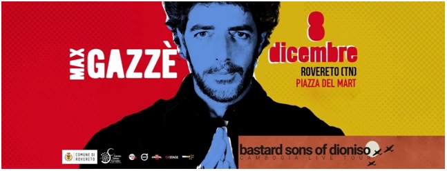 Il concerto è stato pensato appositamente per Rovereto (Max Gazzè non è in tour in questo momento) e sarà aperto dall’esibizione dei The Bastard Sons of Dioniso, che proprio in questi giorni hanno annunciato l’uscita del nuovo album di inediti “Cambogia” per il prossimo 1 dicembre. “Cambogia” arriva dopo sei dischi, un EP, quasi 600 concerti e la partecipazione ai maggiori festival italiani.