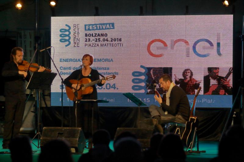 Canti della Resistenza. La pioggia e l’umidità non hanno impedito che il tendone di piazza Matteotti si riempisse per ascoltare il concerto “Canti della resistenza” con tre artisti d’eccezione: la cantante Lucilla Galeazzi, il chitarrista Angelo Colone e il violinista Marco Quaranta. Il progetto “Energia per la memoria”, offerto dal main sponsor del Festival Enel Energia, è stato un momento di grande musica ma anche di partecipazione: quando sono risuonate le strofe di “Bella Ciao” infatti, il pubblico ha risposto cantando assieme agli artisti e creando un momento di grande intensità emotiva. In precedenza i tre artisti avevano sostenuto una prova aperta al pubblico presso il Punto Enel di via Alto Adige, corredata dalle vignette a tema di Monica Diari.