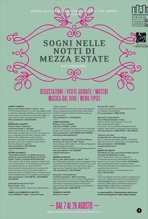 Prosegue l’evento di "Sogni nelle notti di mezza estate" che quest'anno, ancor più delle precedenti edizioni, non lascia che l'imbarazzo della scelta per la sua varietà di eventi in calendario organizzati dalle singole aziende e promossi dalla Strada dell'Olio Extravergine Castel del Monte.