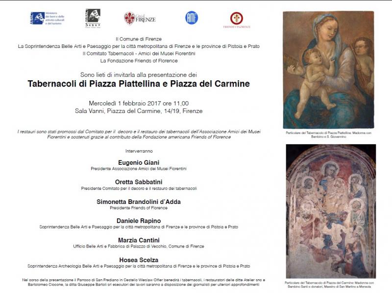 A nome di Friends of Florence siamo lieti di inviarla alla presentazione di due tabernacoli restaurati con il contributo di Friends of Florence e promossi dal Comitato Tabernacoli degli Amici dei Musei che si terrà in Sala Vanni in Piazza del Carmine 14/19 il prossimo 1 febbraio alle ore 11,00.
