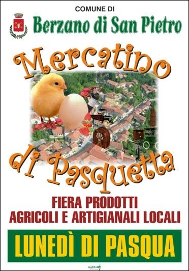 Il Comune di Berzano di San Pietro organizza il giorno Lunedì 10 Aprile 2023 dalle ore 9,00 alle ore 18,00, presso la Piazza del Municipio e lungo le vie del Paese, il “Mercatino di Pasquetta”: annuale mostra mercato interscambio di oggetti antichi, usati e di antiquariato e fiera dei prodotti agricoli ed artigianali, inserita tra le manifestazioni fieristiche della Regione Piemonte.