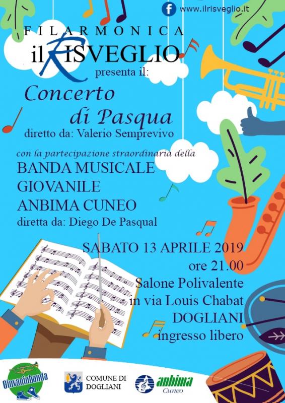 Sabato 13 aprile con inizio alle ore 21 nella Sala Polivalente (ex bocciodromo coperto) situato presso gli impianti sportivi, i musici della banda doglianese si esibiranno dunque nel tradizionale "Concerto di Pasqua" che avrà quest'anno come banda coprotagonista la Banda Giovanile Anbima Cuneo, formatasi nel 2010 quale frutto del progetto “Giovaninbanda” che ha visto coinvolte tutte le province piemontesi. La formazione, diretta dal direttore ospite Diego De Pasqual, che ha recentemente supportato il corso biennale per direttori di banda organizzato dall’Anbima Cuneo, presenterà un programma incentrato sulla musica originale per banda aventi caratteristiche diverse di autori importanti quali Doss, Reinek, Somadossi e Ticheli.