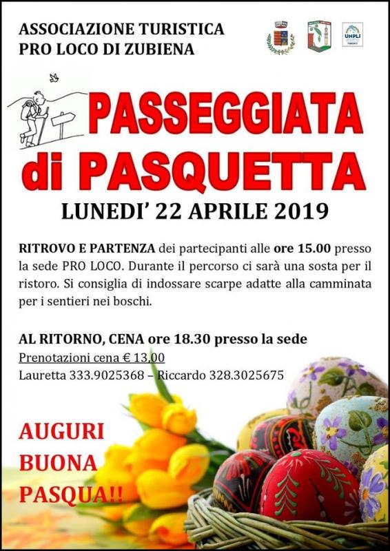 Lunedì 22 Aprile 2019 la Pro Loco organizza la tradizionale Passeggiata di Pasquetta a Zubiena (BI), con la possibilità di gustare un'ottima merenda guardando uno splendido panorama.