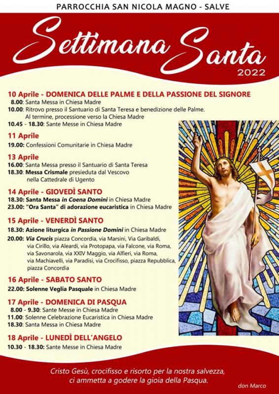 La Settimana Santa si apre con la Domenica delle Palme, in questo giorno vengono benedetti i rami di olivo e di palma. Il Giovedì Santo: si svolge in chiesa la Celebrazione dell'Ultima Cena del Signore. In questo giorno le campane smettono di suonare. Riprenderanno a suonare la notte di Pasqua. Per annunciare le funzioni religiose i chierichetti percorrono le strade del paese suonando la "trozzula". Durante la messa si svolge la lavanda dei piedi ai dodici Apostoli, impersonati ogni anno dal sindaco con alcuni componenti dell'Amministrazione Comunale di Salve, i giovani, gli adulti e gli anziani, vestiti con lunghe tuniche bianche. Al termine della messa spetta a loro distribuire il pane benedetto a tutti i fedeli presenti. Nella seconda parte della serata si svolge l'Adorazione Eucaristica davanti all'Altare della Reposizione. Il Venerdì Santo: Tutto il paese, raccolto in preghiera, partecipa alla solenne processione con le quattordici tappe della "Via Crucis". Prima della processione in Chiesa Madre avviene la celebrazione dell' Azione Liturgica della Passione del Signore, comunemente chiamata"Missa Scerrata" (messa scordata), così chiamata perché non presenta l'abituale sequenza della celebrazione, manca la Consacrazione del pane e del vino e i fedeli ricevono la comunione con le ostie consacrate la sera del Giovedì Santo. La settimana santa termina il Sabato Santo, con la Solenne Veglia Pasquale. Durante il momento della Risurrezione di Cristo avviene la caduta del telo nero che durante la veglia copre il presbiterio della chiesa nascondendo la statua del Risorto. Le campane riprendono a suonare, la statua della Madonna Addolorata vestita con abiti festosi entra trionfante dalla porta principale della chiesa e va con gioia incontro al Risorto. La Domenica di Pasqua, in Chiesa Madre vengono celebrate le SS. Messe.