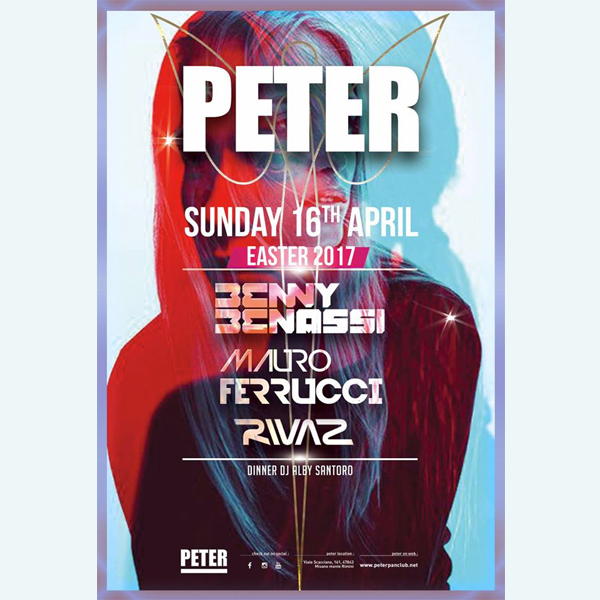 Domenica 16: Benny Benassi, Davide Rivaz, Mauro Ferrucci. Vocalist Tanja Monies e Maurizio Monti. Dinner dj Albi Santoro. Super consolle al Peter Pan per l’Easter Party: Benny Benassi è un’icona della consolle da oltre un decennio, vincitore nel 2008 dei Grammy Awards, autore di hit planetarie quali “Satisfation”, “Beatiful People” e “Cinema”, nonché protagonista di festival assoluti quali Coachella, Ultra, Tomorrowland, EDC e Beyond Wonderland, giusto per nominarne alcuni. Sin dagli anni novanta Davide Rivaz fa parte della stretta elite di dj e produttori sempre in costante evoluzione: merito del suo feeling immediato con la dancefloor e una sana dose di esperienza, che non guasta mai.