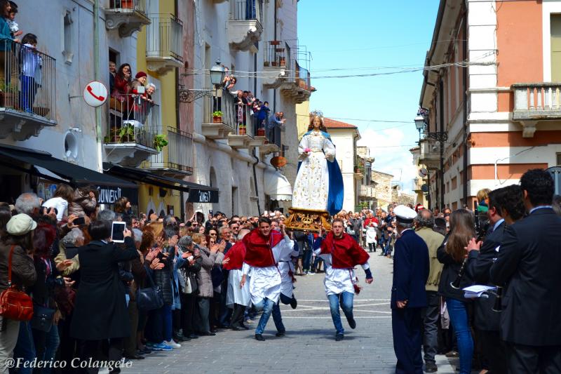 La manifestazione della Pasqua si ritiene iniziata nella seconda metà del ‘800, o forse prima. Essa non ha la notorietà dell’altra consimile, che nello stesso giorno si effettua a Sulmona, col nome de “la Madonna che scappa in piazza”, ma non per questo è meno spettacolare. Certamente è molto amata dagli introdacquesi. Tutto è molto semplice: preparata la statua della Madonna nella Chiesa della S.S. Trinità, si inizia da parte di diversi gruppi di giovani la gara per il trasporto della statua stessa; una gara, che a volte si svolge in un clima di accesa competizione, a base di offerte crescenti, fino all’ultima, la più alta, che deciderà quale quadriglia di portatori dovrà effettuare la corsa. A Mezzogiorno in punto mentre la piazza è gremita di folla in attesa spasmodica, ecco apparire lentamente dalla salita di San Rocco la statua della Madonna vestita a lutto, portata a spalla da quattro giovani. La Madonna si incammina verso la parte opposta della piazza dove c’è in attesa il Cristo Risorto, all’incirca metà della piazza quando si intravede il Cristo Risorto i portatori pian piano danno inizio alla frenetica Volata tra spari di mortaretti, suono di campane e banda locale che suona in sottofondo, il mantello nero della Madonna cade dalle sue spalle ed ella riappare nella consueta e sontuosa veste celeste, sulla mano destra apposta del bianco fazzoletto da lutto quasi per incanto appare una rosa. Un grido prorompe dalla folla, un grido di liberazione dopo l’attesa spasmodica, è un momento di grande emozione generale!
