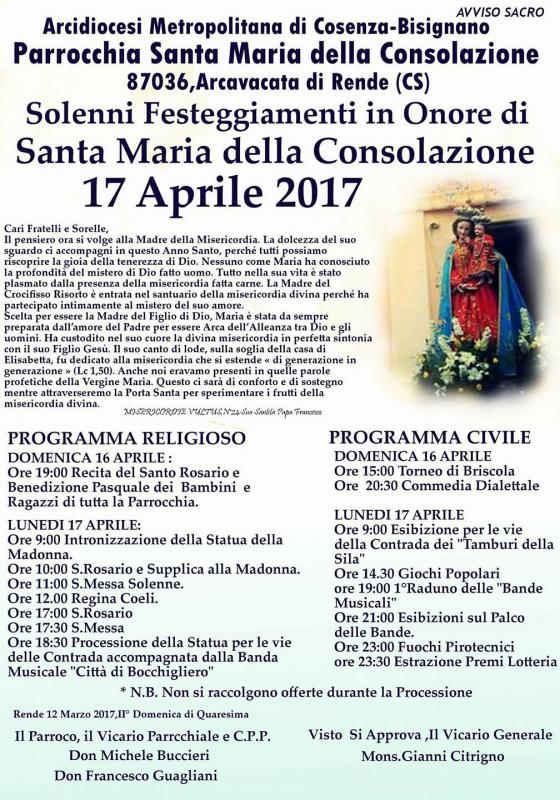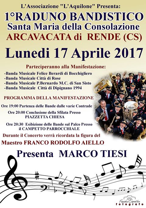 Lunedì 17 aprile 2017 a Arcavacata di Rende (CS) la Pasquetta è il moneto dei Sollenni Festeggiamenti Santa Maria della Consolazione e del 1^ Raduno Bandistico.