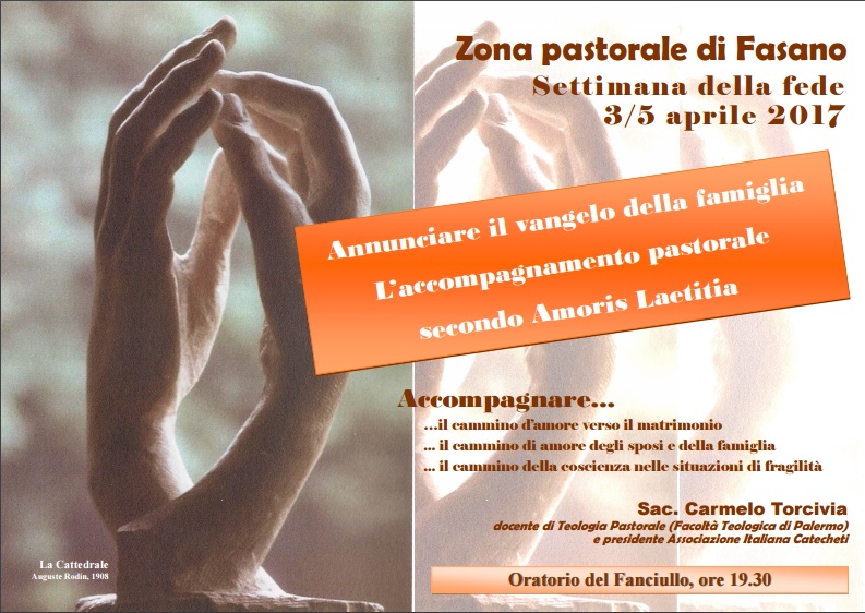 Sarà ispirata proprio a questo documento, “Annunciare il Vangelo della famiglia – l’accompagnamento pastorale” la settimana della fede, il tradizionale appuntamento pre-pasquale proposto dalla Zona pastorale di Fasano, che comprende le quattro parrocchie cittadine oltre quelle di Savelletri e della Selva, che si svolgerà all’Oratorio del Fanciullo dal 3 al 5 aprile prossimi alle ore 19,30.