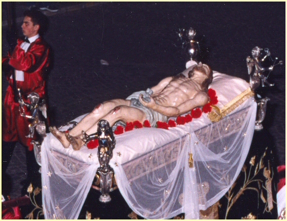 E’ la struggente rappresentazione del “rito funebre” della traslazione del Cristo, deposto dalla Croce, verso il Sepolcro. Narra il Vangelo di Marco (15,46) che un membro del sinedrio, Giuseppe d’Arimatea, ebbe autorizzazione da Pilato a deporre il corpo di Gesù e “comprato un lenzuolo, lo calò giù dalla croce e, avvoltolo nel lenzuolo, lo depose in un sepolcro scavato nella roccia”. Non si conosce la data della prima processione del Venerdi Santo a Sulmona. Ma è certo che il primo Venerdi Santo trinitario risale alla sera del 13 aprile 1827. Un documento custodito nell’archivio dell’Arcisodalizio attesta infatti che quell’anno l’organizzazione del corteo del Cristo Morto passò dalla Congrega dei Nobili all’Arciconfraternita trinitaria.