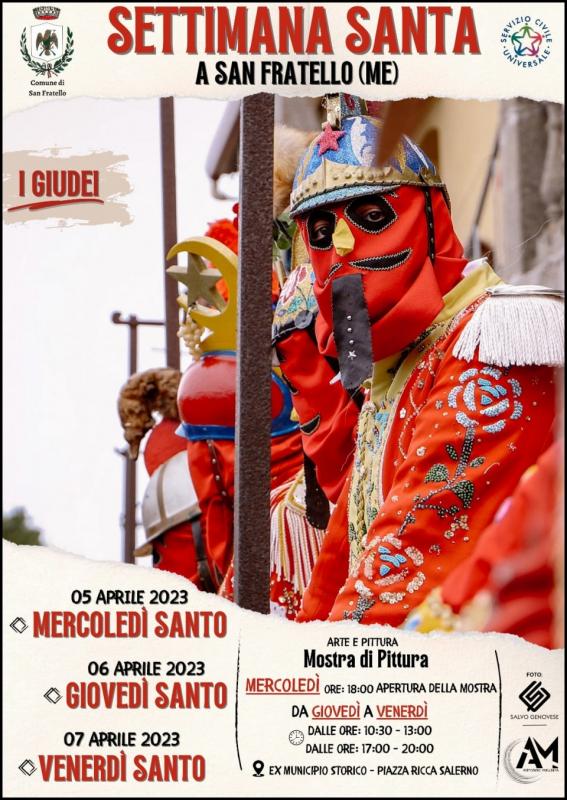 Gesù entra a Gerusalemme la Domenica delle Palme. A San Fratello, dove le tradizioni sono ancora rispettate, si sente un forte impeto ed una massiccia partecipazione che vede coinvolti tutti gli abitanti. Non c’è interruzione di sorta perché anche nelle giornate del Lunedì e Martedì Santo ognuno si prepara per essere di grande aiuto alla realizzazione scenografica. All’alba del Mercoledì Santo inizia la Festa dei Giudei e vengono preparati i sepolcri in tutte le chiese parrocchiali. Anche le donne con religioso silenzio e luttuoso dolore cingono con manto nero il capo della Madonna della Pietà, espongono la Santa Croce, portano in segno votivo i piatti dove germogliano grano, lenticchie e ceci cresciuti per qualche settimana al buio.Ma quella che maggiormente attira il nostro interesse è la Festa dei Giudei che si svolge nei giorni di Mercoledì, Giovedì e Venerdì Santo, unica in tutta la Sicilia. Come dicevamo, di origini medievali, la rappresentazione è estremamente suggestiva e ricorda i Giudei che percossero e condussero Cristo al Calvario. (Tratto da http://www.comunedisanfratello.it)