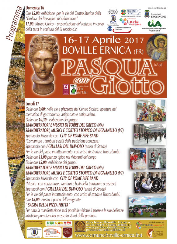 La manifestazione PASQUA CON GIOTTO è giunta alla XIV edizione e come ogni anno richiamerà nel centro storico di Boville Ernica (dal 2009 uno dei "borghi più belli d'Italia) circa 10000 visitatori nelle giornate di Pasqua e Pasquetta.Saràpossibile effettuare visite guidate nel centro storico e alle bellezze che esso custodisce: ANGELO DI GIOTTO (unico mosaico intatto dell'artista); SARCOFAGO PALEOCRISTIANO (sul quale è rappresentato il presepe più antico del mondo IV sec d.c.Inoltre le giornate vedranno la presenza di sbandieratori,cortei storici,artisti di stada,giocolieri e trucca bimbi,band di cornamuse.