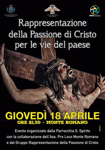 La Parrocchia Santo Spirito, in collaborazione con l’Associazione Pro Loco Monte Romano e il Gruppo Rappresentazione della Passione di Cristo, organizzana Giovedì 18 Aprile 2019, alle ore 21,30, la storica "Rappresentazione della Passione di Cristo per le vie del paese".