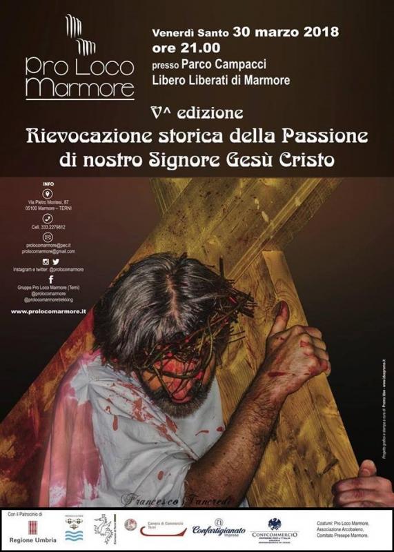 L'evento ormai consolidato della Passione di Cristo conterà circa 120 figuranti in costume ed avrà luogo tra le esclusive naturali peculiarità di Marmore, sotto la luce soffusa e musiche a tema, presso il Parco Libero Liberati (Campacci).