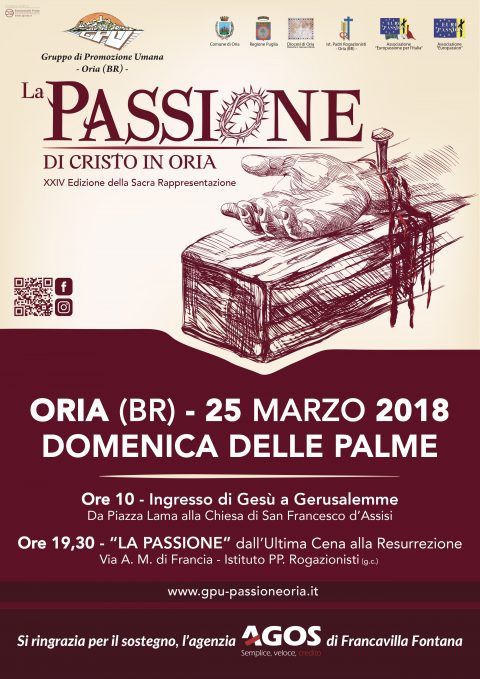 Il Gruppo di Promozione Umana rappresenta la XXIV edizione del dramma sacro “La Passione di Cristo in Oria”, che come ogni anno sarà Domenica delle Palme, 25 marzo 2018 alle ore 10 la prima scena in piazza Lama con “l’ingresso di Gesù a Gerusalmenne”, al tramonto alle ore 19.30 “La Passione” dall’ultima cena alla Resurrezione presso l’Ist. PP. Rogazionisti Oria (BR).