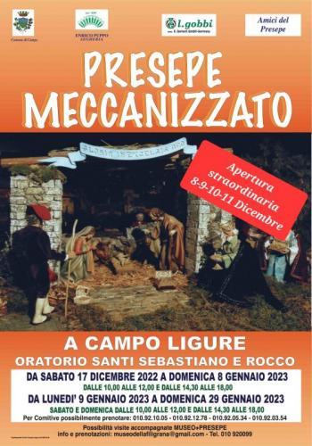 Il Presepe Meccanizzato di Campo Ligure sarà aperto al pubblico presso l'Oratiorio dei Santi Sebasatiano e Rocco dal 16 Dicembre 2023 al 28 Gennaio 2024 negli orari riportati nella locandina.