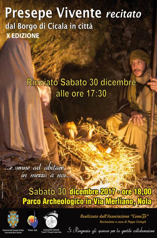 Per motivi dovuti al mal tempo la rappresentazione del presepe vivente recitato di Nola è stata rinviata a sabato 30 dicembre 2017, dalle ore 17:30, presso il Parco Archeologico in Via Merliano di Nola.