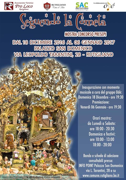 A cura dell’Associazione Turistica Pro Loco Rutigliano e dell’Assessorato alla Cultura e al Turismo del Comune di Rutigliano, con la partecipazione del Sistema Ambiente Cultura (Sac) «Mari tra le Mura» dei Comuni di Conversano, Mola di Bari, Polignano a Mare e Rutigliano, e in collaborazione con InPuglia365 - Agenzia Regionale del Turismo, è allestita a Palazzo San Domenico (via Leopoldo Tarantini, 28) la 9^ Mostra di Presepi «Seguendo la Cometa...».