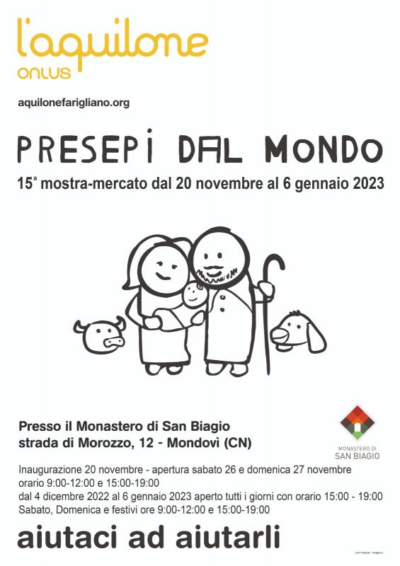 Con un allestimento dei nuovi arrivi, quest’anno si potranno trovare natività provenienti da: Kyrgyzstan, Guatemala, Thailandia, ,Indonesia, Turchia, Kenia, Perù , Ecuador, Ucraina, Polonia che da domenica 20 Novembre sarà possibile semplicemente ammirare o volendo acquisire, dietro contributo minimo, le varie natività provenienti da ogni parte del mondo, presepi della tradizione locale, opere d’autore e sacre rappresentazioni artigianali di ogni dimensione e realizzati con i materiali più disparati, con una sezione dedicata ai carillon e alla palle di neve di ogni foggia e dimensione, che certamente affascineranno e conquisteranno i visitatori e inoltre dalla Repubblica Ceca si potranno trovare gli addobbi dipinti a mano per l’albero di Natale ..
