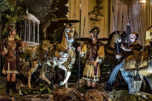Regale nell’ampiezza ed eccezionale nelle sue componenti: la Sacra Famiglia ne costituisce naturalmente il nucleo centrale, insieme agli angeli, ai tre sontuosi magi, agli armigeri e ai soldati. Ogni statuina è impreziosita da eleganti ed elaborati costumi in seta, cotone, velluto, tela jeans. Gli abiti sono inoltre caratterizzati da passamanerie in argento e filo d’oro, corpetti e armature in cuoio e metallo argentato che fanno d’ogni personaggio un piccolo capolavoro. E il tutto è qualificato da accessori sofisticati: corone e sciabole, lance e scudi in metallo sbalzato, catene e cinture in cuoio, utensili e attrezzi che indicano una committenza di altissimo rango e di cospicue disponibilità economiche. Qualità e mestiere nelle parti scolpite si apprezzano sia nei pastori che nei popolani d’ambo i sessi, con una varietà di intonazioni, un gusto spiccato per il dettaglio di pregio, una forza plastica di impostazione classica che trova riscontri anche nel variopinto serraglio formato, oltre che dal bue e dall’asinello, dai tre magnifici cavalli dei magi, da due esotici cammelli e, poi, come da tradizione, da mucche e pecore, capre e montoni.