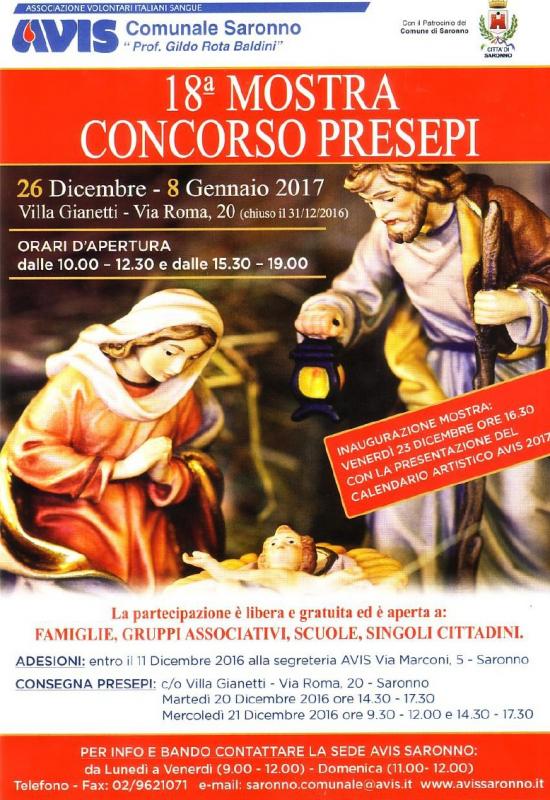 Dal 26 dicembre 2016 al 8 gennaio 2017 AVIS Saronno organizza la Mostra-Concorso Presepi. La mostra aprirà presso le sale della Villa Gianetti in via Roma a Saronno il 26 dicembre, con inaugurazione venerdì 23 dicembre alle ore 16.30 (dove verrà presentato anche il calendario artistico AVIS 2017).