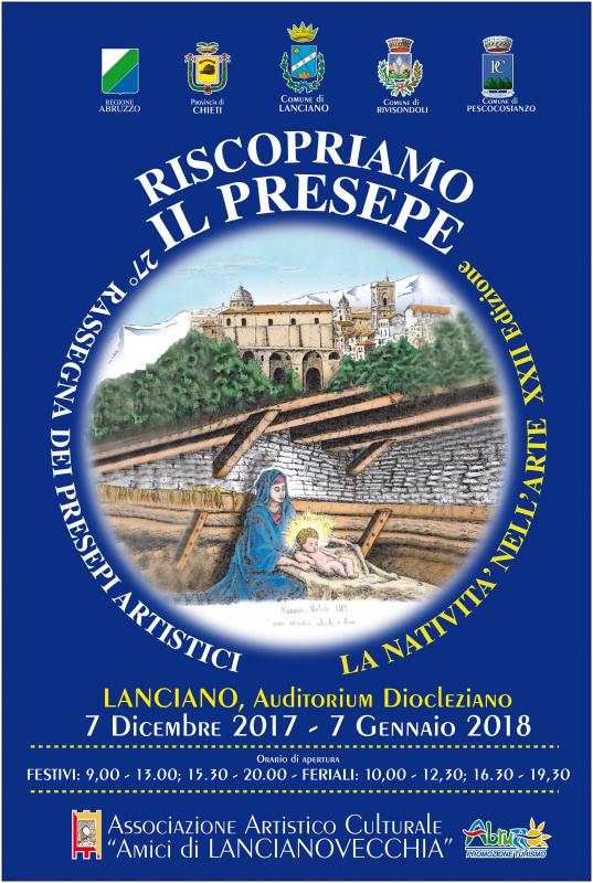 Torna anche quest’anno la rassegna di presepi artistici "Riscopriamo il Presepe”, organizzata dall'Associazione artistico-culturale "Amici di Lancianovecchia" nei locali dell’Auditorium Diocleziano di Lanciano (Ch), da giovedì 7 dicembre 2017 a domenica 7 gennaio 2018. L’inaugurazione del 7 dicembre inizia alle 17:00 con il concerto degli studenti della Scuola Media “G.Mazzini” - Indirizzo Musicale di Lanciano presso l’omonima sala comunale ai piedi della Torre Civica e culmina poi con il taglio del nastro fatto insieme alle istituzioni locali per aprire ufficialmente la XXVII edizione della rassegna al Diocleziano. Come da tradizione, sono attesi espositori e presepisti da numerose regioni d'Italia, che grazie alla qualità e alla bellezza delle loro creazioni contribuiscono a far conoscere ai visitatori l'antica ma sempre attuale arte del presepe, rafforzando il prestigio della manifestazione presepistica più antica di Lanciano.