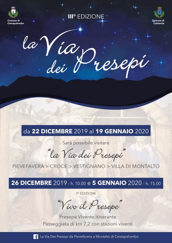Gli abitanti delle frazioni di Montalto di Cessapalombo, Vestignano, Croce e Pievefavera in collaborazione con i Comuni di Cessapalombo e Caldarola (MC), sono lieti di invitarvi da Domenica 22 Dicembre 2019 a Domenica 19 Gennaio 2020 alla III°Edzione della "VIA DEI PRESEPI" dove durante queste settimane sarà possibile visitare i presepi (di tutte le dimensioni e materiali) creati dagli abitanti delle frazioni stesse.