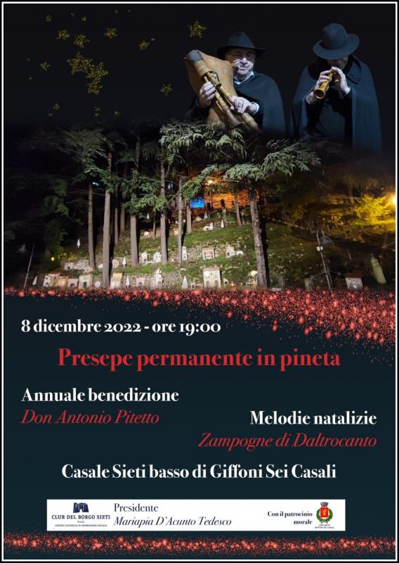 A Casale Sieti Basso di Giffoni Sei Casali in provincia di Salerno si svolge nella giornata di Giovedì 08 Dicembre 2022 alle ore 19.00, l'inaugurazione del Presepe Permanente in Pineta.