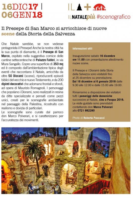 Dal 16 dicembre 2017 al 6 gennaio 2018, tra i tantissimi eventi di Natale a Fano, si può visitare il Presepe di San Marco e Diorami della storia della Salvezza ubicato nelle antiche cantine di Palazzo Fabbri (1700), in via Mura Sangallo.