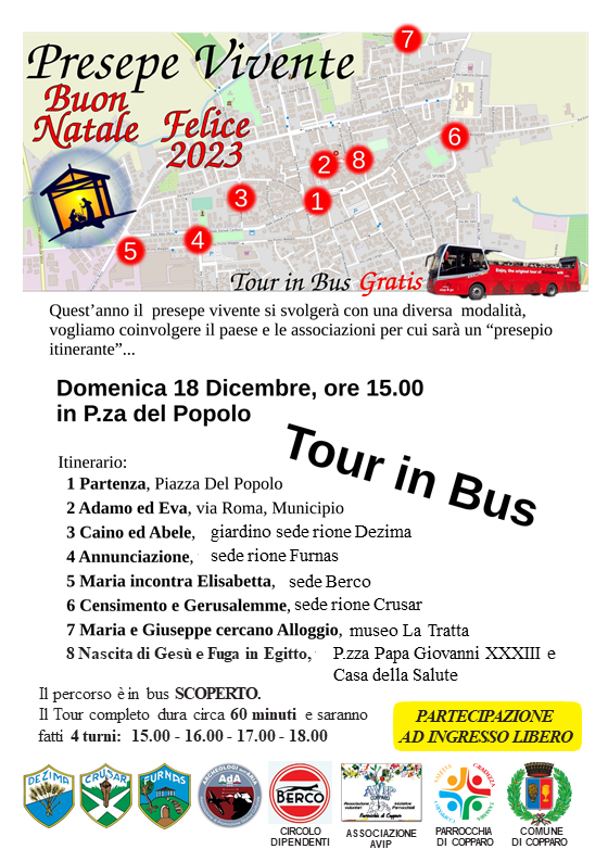 Sarà pertanto un "Presepe Itinerante": un autobus scoperto accompagnerà i visitatori in alcuni punti di Copparo, dove sono state allestite le scene del Presepe Vivente.
