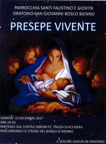 Venerdì 22 dicembre 2017 la Parrocchia dei S.S. Faustino e Giovita e l'Oratorio S. Giovanni Bosco Bienno in collaborazione con il Comune di Bienno presentano il presepe vivente, il percorso religioso e artistico ritraente la nascita di Gesù arriva nel borgo di Bienno.