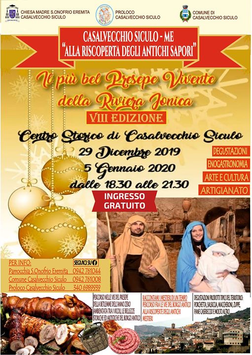 Domenica 29 Dicembre 2019 e Domenica 05 Gennaio 2020 alle ore 18:30 siete attesi a Casalvecchio Siculo (ME)...quello che si propone non è il solito Presepe Vivente da guardare e contemplare, si è ricreato una città della Palestina dell’anno 0 con tutte le comparse che la animano e la fanno vivere di nuova vita...Vi si propone di immergerVi in un ambientazione suggestiva con la visita al quartiere delle Osterie dove vi si delizierà con le pietanze tipiche della civiltà contadina: Maccheroni al ragù, zuppe, porchetta e tanto tanto altro ancora… La tradizione Casalvetina delle Saqre si unisce alla Rappresentazione del Presepe Vivente per offrirVi una manifestazione completa, ricca, suggestiva e coinvolgente.