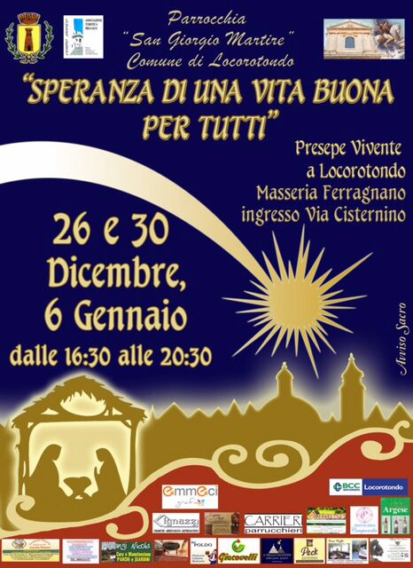 La Parrocchia san Giorgio Martire di Locorotondo con il patrocinio di Comune di Locorotondo e Pro Loco Locorotondo organizza il Presepe Vivente in contrada Caramia a Masseria Ferragnano.