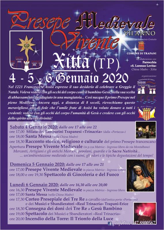 L'Associazione "Tradumari&venti", con annessi Gruppo Medievale "Monte San Giuliano - Erice" ed i Musici e Sbandieratori "Real Trinacria" Trapani-Erice, in collaborazione con la Parrocchia "S. Lorenzo Levita" di Xitta (TP) e col Patrocinio del Comune di Trapani, presenta la VII edizione del PRESEPE VIVENTE MEDIEVALE - XITTA 2020, che si terrà nell'antica frazione trapanese di Xitta dal 4 al 6 Gennaio 2020.